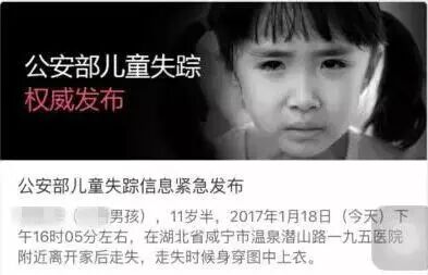 这晚,咸宁人的微信朋友圈、QQ群都被这条消息刷屏了。临近年关、天寒地冻,孩子去了哪儿?一时间,大家如约好一般,一个接一个地转发这条寻人启事。大家都在祈祷:孩子赶快被找到吧!