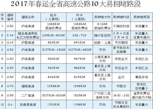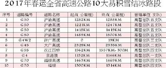 省公安交管局同时公布了春运期间高速公路10大易积雪结冰路段、10大易拥堵路段。