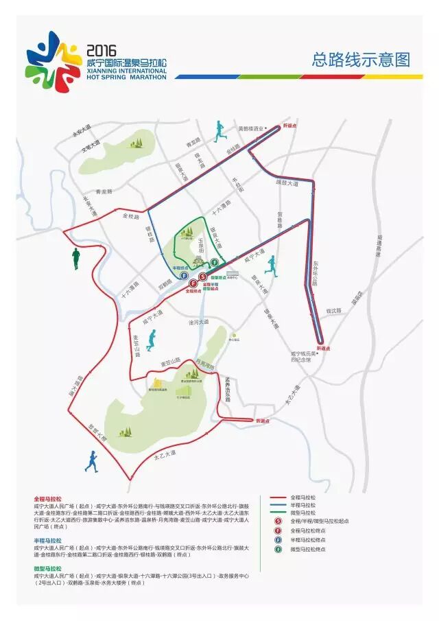 全程马拉松从咸宁人民广场起跑,途经咸宁大道、东外环公路、旗鼓大道、金桂路、嫦娥大道、西外环、太乙大道、旅游集散中心、孟养浩东路、温泉桥、月亮湾路、麦笠山路,再经咸宁大道到终点咸宁人民广场,充分展示了咸宁城市的美丽风光和日新月异的城市发展轨迹。