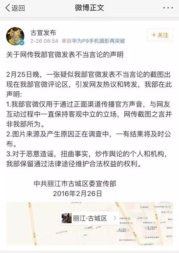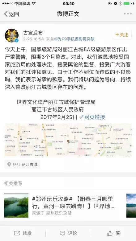 云南丽江市古城区委宣传部官方微博@古宣发布 在丽江古城被国家旅游局宣布严重警告后表态