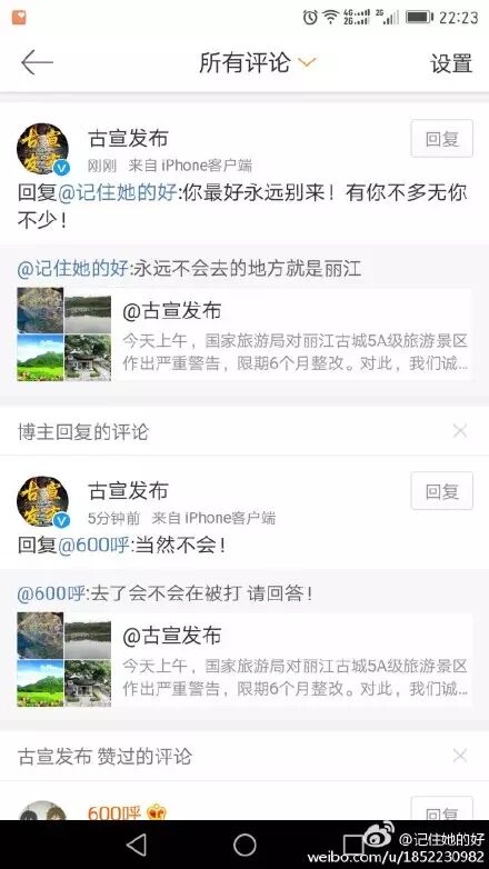 微博用户@记住她的好 说“永远不会去的地方就是丽江”,疑似该官方微博答复“你最好永远别来!有你不多无你不少!”