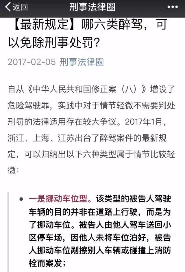 该文称:2017年1月,浙江、上海、江苏出台了关于醉驾案件的最新规定,有六类醉酒驾车情形属于情节比较轻微,可以免除刑事处罚,分别是:挪动车位型、救治病人型、睡觉休息型、隔时醉驾型、尚未驶出型、被醉驾追尾型。