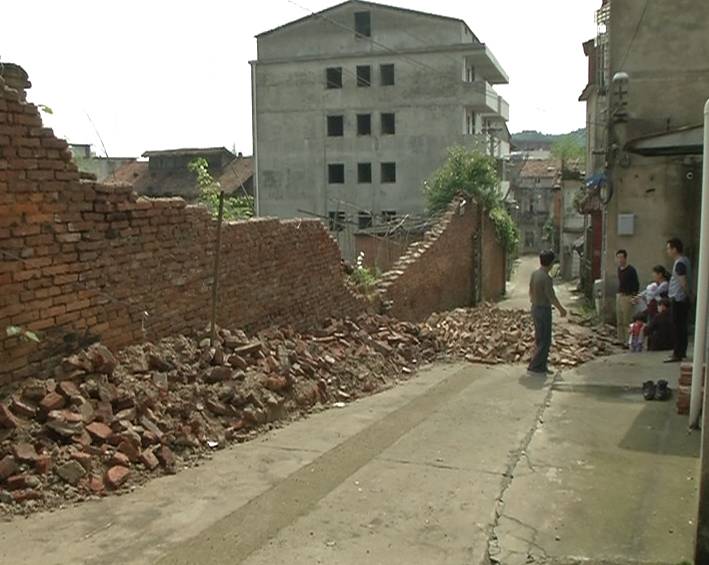 云上咸宁报道(记者 邓超)昨晚的一场狂风暴雨让咸安区长安社区大畈西路的居民忧心忡忡,这里的一堵围墙因为年久失修,曾多次垮塌,结果正如居民所预料的,昨晚那堵围墙又垮了一段,所幸没有造成人员伤亡。
