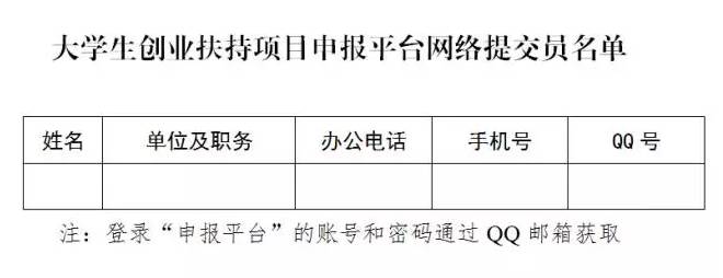 (一)各地人社、教育、团委及各高校,要高度重视,密切合作,加强宣传,精心组织,确保符合条件、有申报意愿的大学生能按时完成网上申报。各地人社、团委、高校分别指定一名在编人员作为“大学生创业扶持项目申报平台网络提交员”,按照分配的账号和密码,登录“申报平台”及时完善“网络提交员”信息,填写《大学生创业扶持项目申报平台网络提交员名单》(见附件),于4月20日之前,由各市州人社、团委汇总后分别报省人社厅、团省委,各高校报省教育厅。