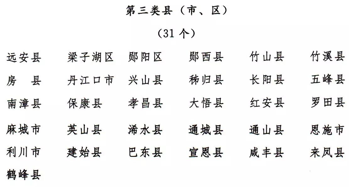 第三类县(市、区):恩施市、远安县、南漳县、丹江口市、保康县