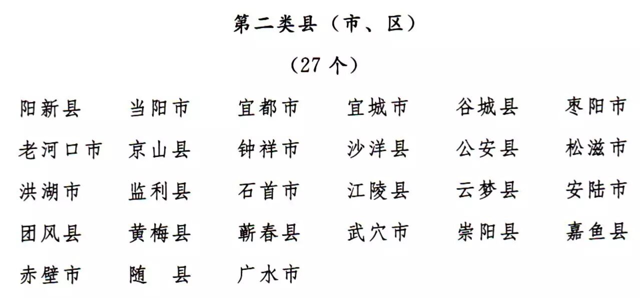 第二类县(市、区):宜都市、钟祥市、枣阳市、老河口市、 京山县、宜城市、谷城县