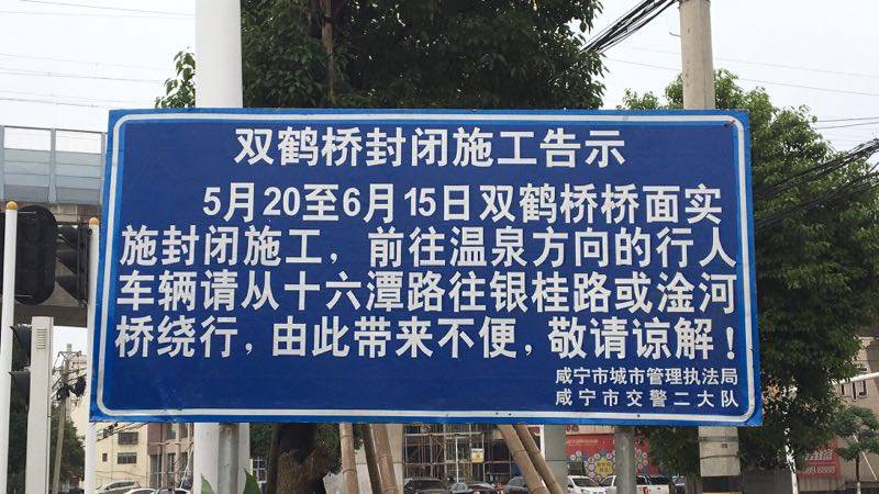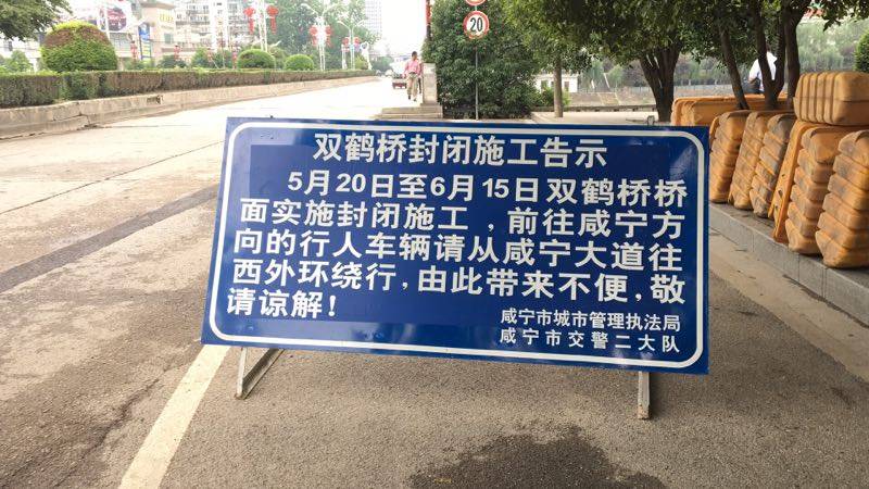 5月20日至6月15日双鹤桥桥面全封闭施工,前往咸安方向的行人车辆请从咸宁大道往西外环绕行,由此带来不便,敬请谅解!