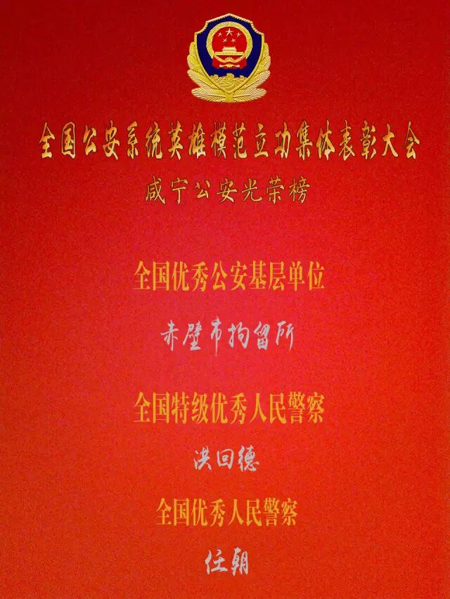 他们分别是:赤壁拘留所荣获全国优秀公安基层单位、民警洪回德荣获全国特级优秀人民警察、民警任朝荣获全国优秀人民警察。
