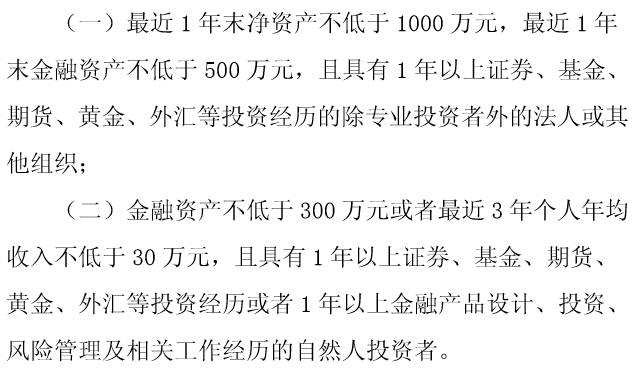 一是金融资产不低于500万元,或者最近3年个人年均收入不低于50万元;