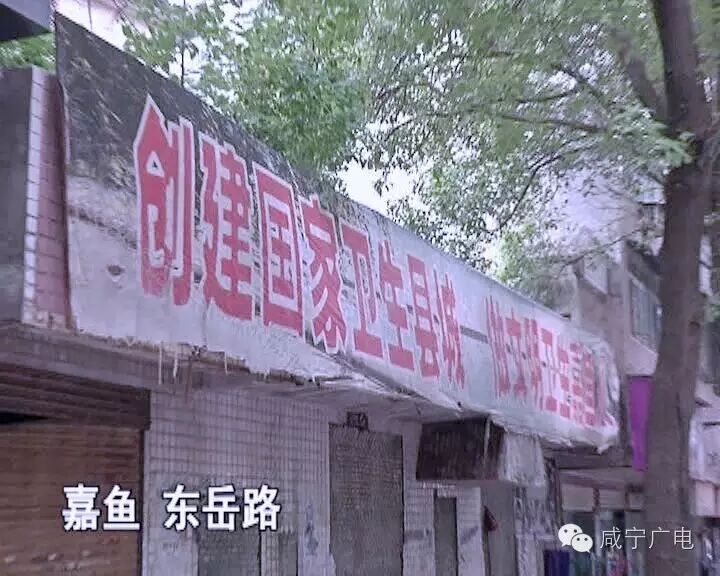 在嘉鱼县东岳路有一处创卫的宣传条幅破烂不堪