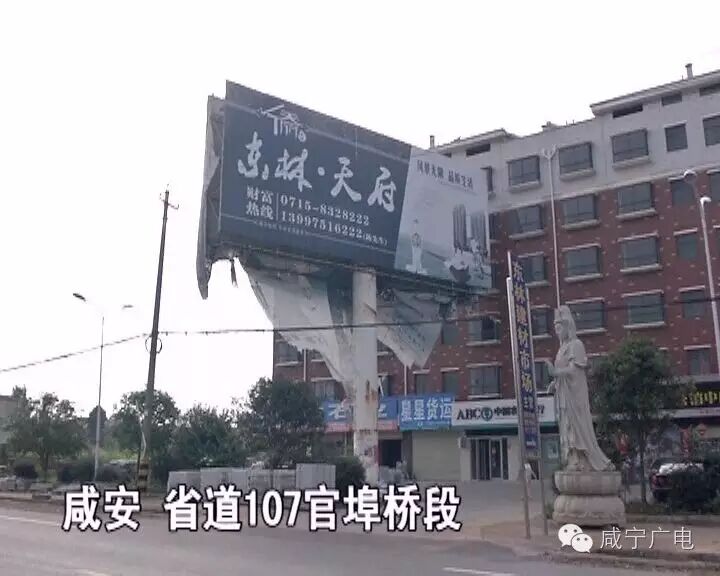 咸安区省道107官埠桥段有一处户外广告牌破损