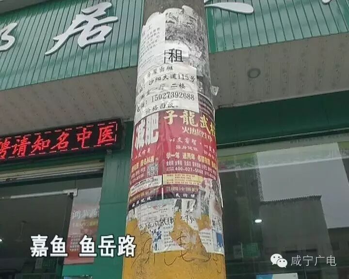 在嘉鱼县鱼岳路多数电线杆上都有牛皮癣