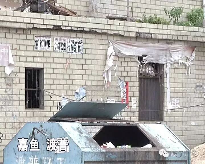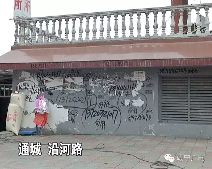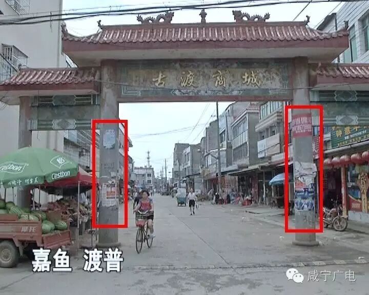 在嘉鱼县渡普镇的街边住房的墙面、古渡商城门楼上有牛皮癣