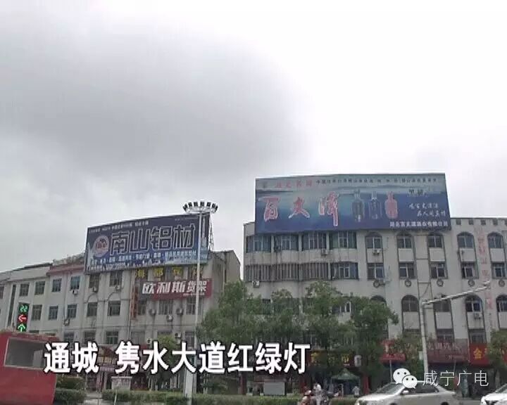 在通城县隽水大道红绿灯处可以明显看到违规广告牌存在。