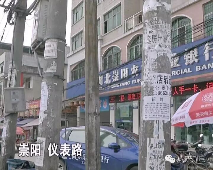 在崇阳县仪表路几乎所有的电线杆上都有牛皮癣